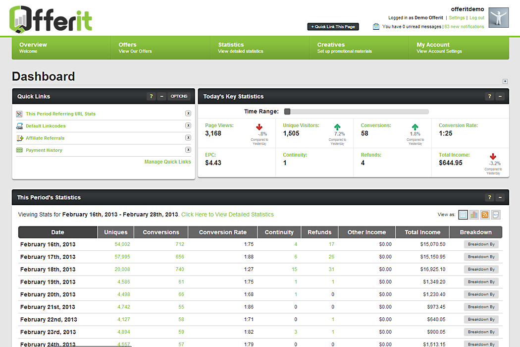 Your advertisers have their own dedicated area in Offerit to review their stats, creatives, and offers available to them in your network. Sticky settings will save each individual advertiser's preferences for the next time they visit their dashboard. Another cool feature available is quick links, allowing advertisers to "bookmark" the pages they visit the most. Offerit provides you and your advertisers a seamless and smooth user experience.