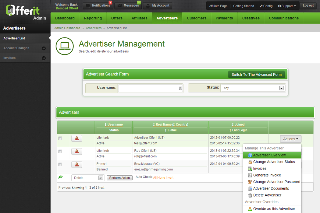 Whether you have a few or an enormous number of advertisers in your network, Offerit allows you to easily manage your advertisers. We give you access to an Advertiser Admin to review every single advertiser in your network.