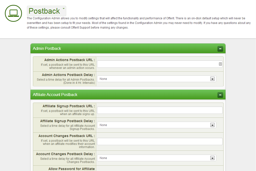 - Affiliate Postbacks: Affiliates can also set up their own postbacks, which will notify them of new conversions, continuity, and other events connected to their offers.