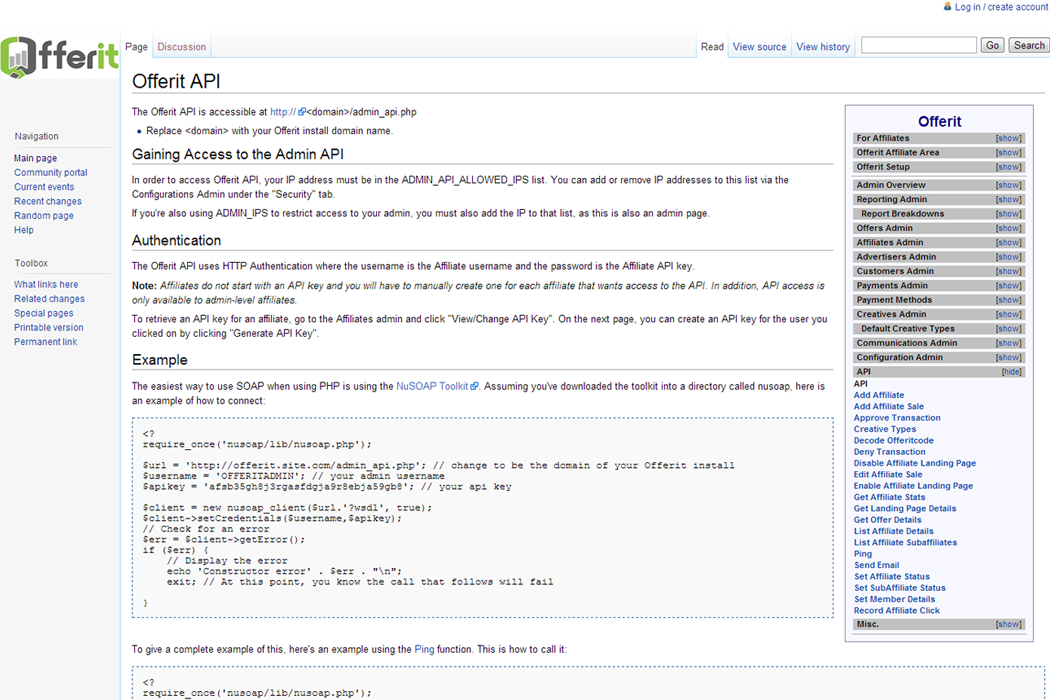 With some programming knowledge, interfacing with the Offerit API Library is simple. For security purposes, you will need to allow your IP address to have access to your Offerit installation as well obtain an API key (found in your Offerit Installation). Next, you will need a script or program outside of Offerit to point towards your installation, where it can then make specific calls to our Library. This includes: