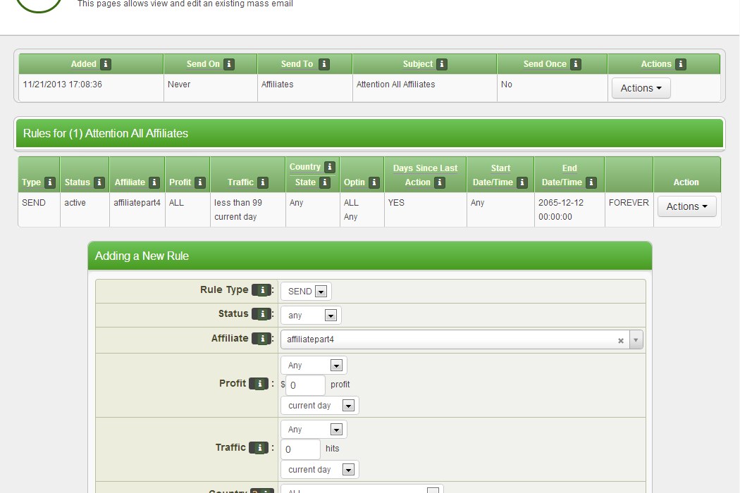 - Start / End Dates: Allow a marketing campaign to run over a few hours or over a few months. Running a mailer over time is useful when you want to send out messages to affiliates or customers when they meet specific targeting requirements. (see below)